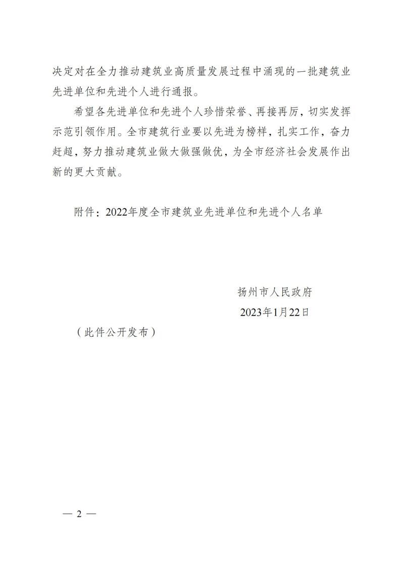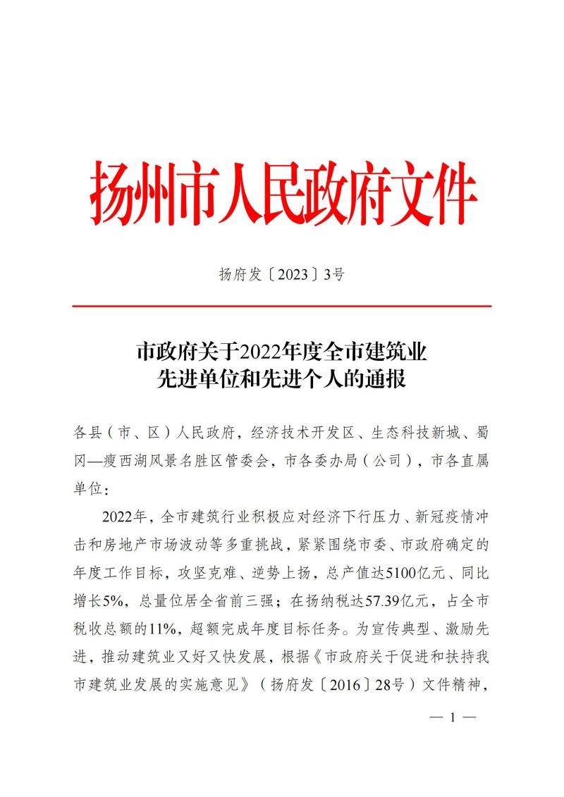 市政府关于2022年度全市建筑业先进单位和先进个人的通报