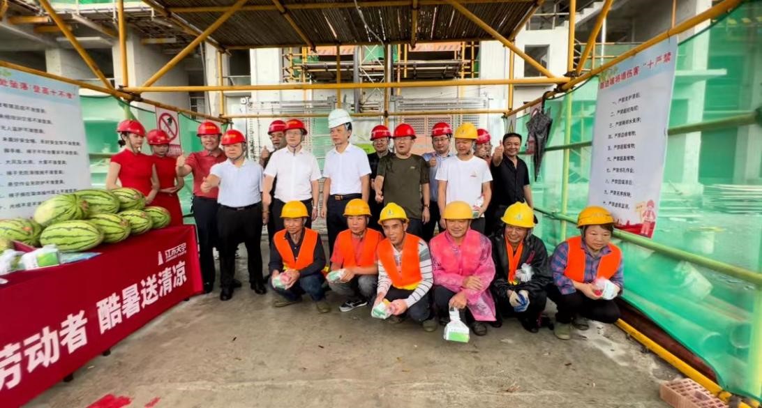 参加议式的领导们手执喜庆的铁锹,共同完成了7#楼主体工程最后一注混凝土的浇筑,标志着江院城市森林7#楼项目顺利封顶。现场仪式结束后,集团领导为施工人员送上“清凉物资”表示慰问,感谢他们为项目建设付出的辛勤劳动。